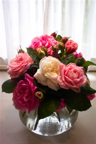 2. I barely grow vegetables anymore in my small allotment garden. Instead I have 400 roses just for cutting. Many Austin do not last as long as other roses in vases, but like you mentioned: there is always more to come. Like you I also rarely pick the roses around my house. I hope you will get your allotment soon Zoë, they have become very popular here too! Lovely posy Helen – I need to get more of those round vases